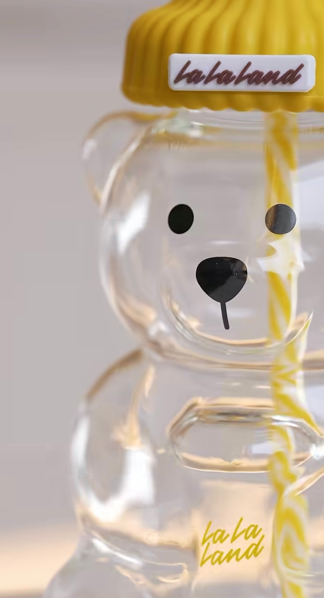 ✨ Glass Bear Cup with Straw & Yellow Beanie Lid ✨