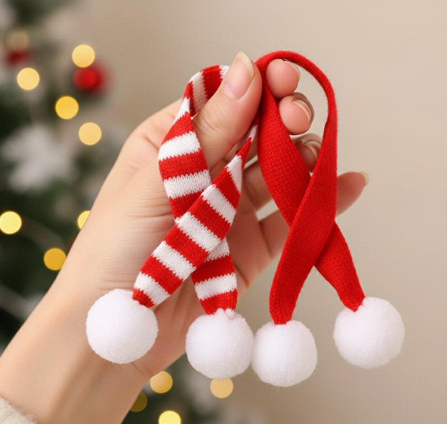• 3 x Mini Knit Scarves: Complete with fluffy white pom-poms! Includes one solid red, one festive red/green stripe, and one candy-cane red/white stripe.